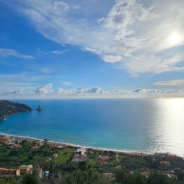 Aus dem weiter unten gelegenen, eher touristischen Agios Gordios kommen täglich Ruhe- und Naturliebende Spaziergänger hoch in das malerische Bergdörfchen oder wandern noch höher bis zum "Dach der Welt", um wunderschöne Blicke auf das blaue Meer und über die saftig grüne Insel mit ihren uralten Olivenhainen oder aber spektakuläre Sonnenuntergänge zu genießen.